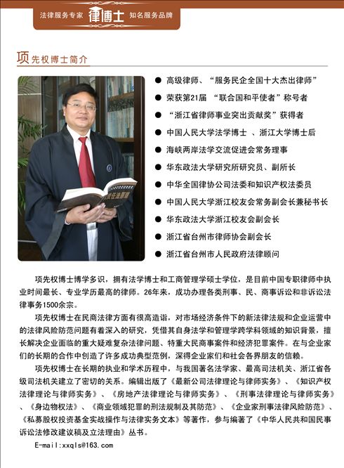 浙江新臺州律師事務所成立于1998年,是一家大型綜合性法律服務機構。以杭州為管理中心,在臺州、上海、北京設有分所或辦事機構,服務范圍輻射長三角地區。 本所榮獲“浙江省省級優秀律師事務所”、“服務民營企業全國優秀律師事務所”等榮譽稱號。主任項先權博士以其浙江大學工商管理碩士、中國人民大學法學博士、浙江大學博士后的教育背景及從業26年深厚的專業功力,在國內法學界享有很高的聲望。他帶領專業法律服務團隊取得了良好的業績與榮耀,獲得了社會的充分認可與褒揚。先后榮獲“浙江省律師事業突出貢獻獎”、“服務民營企業全國十大杰出律師”、“聯合國和平使者”等諸多榮譽稱號。 本所下設:婚姻家庭法律部、刑事辯護法律部、訴訟仲裁部、公司證券事務部、知識產權事務部、建筑房地產事務部、企業法律顧問部、律博士會員服務中心等專業服務部門。 感謝您對浙江新臺州律師事務所(杭州所)的支持與關心! 如有法律咨詢、業務委托或欲進一步獲取有關信息,請與我們聯系: 杭州辦公地址 浙江省杭州市西湖區文三路369號文三數碼大廈12層1201室(浙江省檢察院與國土資源局中間) 郵編:310012 傳真:0571-88930756 聯系人:李律師 手機:13656813663 辦公:0571-56883853 :676809687 群:杭州法律咨詢群(126880116)、杭州律師咨詢群(111658091) E-MAIL: LIYYLAWYER@163.COM 網址:://WWW.TZ-LAWYER.COM