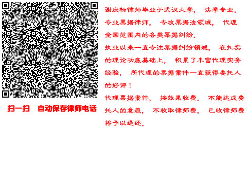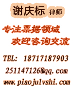 百度搜索:票據律師謝慶標 姓名:謝慶標律師 手機:18717187903(歡迎咨詢票據法律問題) 傳真:027-52301851 執業證號:14201201010330220 律師事務所:湖北京佑律師事務所 地址:武漢市武昌區武珞路330號聯投新大地6層 郵編:430000 謝慶標律師畢業于武漢大學,法學專業。專業票 據律師,專攻票據法領域,代理全國范圍內的各 類票據糾紛。 執業以來一直專注票據糾紛領域,在扎實的理論 功底基礎上,積累了豐富代理實務經驗,所代理 的票據案件一直獲得委托人的好評! 代理票據案件,按效果收費。不能達成委托人的 意愿,不收取律師費,已收律師費將予以退還。