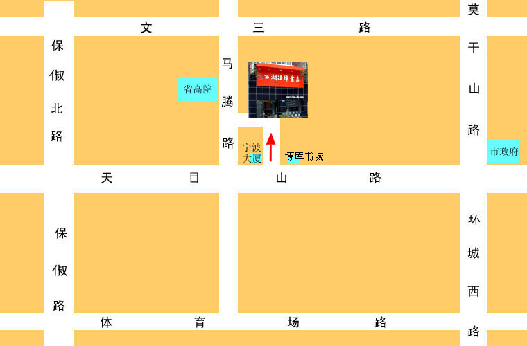 從市政府沿天目山路向西,天目山路46號寧波大廈東側,博庫書城西側,馬塍路口不到右拐